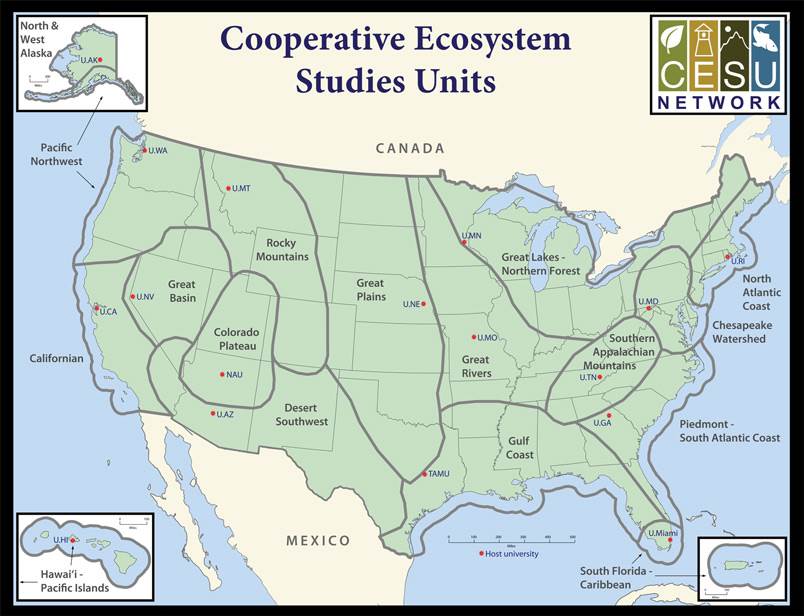 The Cooperative Ecosystem Studies Units (CESU) Network is a national consortium of federal agencies, tribes, academic institutions, state and local governments, nongovernmental conservation organizations, and other partners working together to support informed public trust resource stewardship. The CESU Network includes more than 475 nonfederal partners and 17 federal agencies across seventeen CESUs representing biogeographic regions encompassing all 50 states, the District of Columbia, and U.S. insular areas. The CESU Network is well-positioned as a platform to support research, technical assistance, education, and capacity building that is responsive to long-standing and contemporary science and resource management priorities.